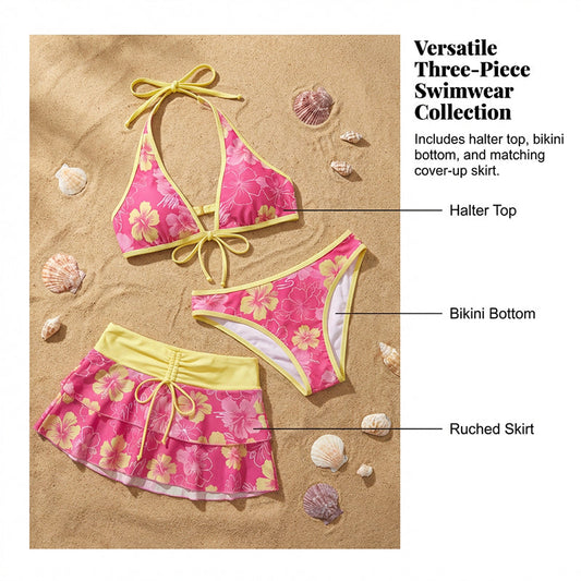 3-Piece Floral Halter Bikini Set with Ruffled Skirt