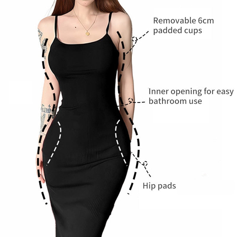 BUILT-IN BUST AND HIP PADS – Features removable bust cups and reinforced hip pads at the side waist, providing natural support and shaping. Enhances chest definition and improves hip contour, allowing confident wear without additional undergarments.